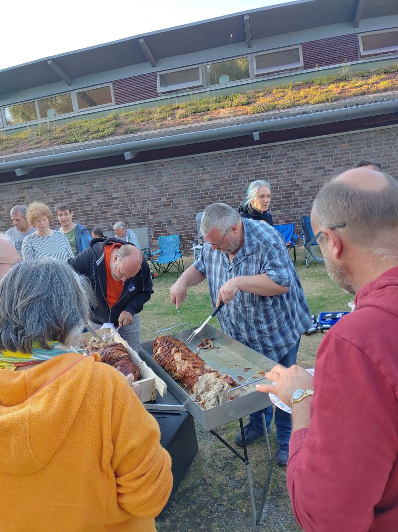 - ab ca. 19:00 Uhr: Gemeinsames Spanferkelessen, dazu Kartoffelsalat, Bayrisch Kraut, Krautsalat, Partybrötchen und diverse Saucen und Dips.